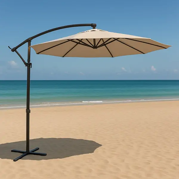 • Suncobran je opremljen poprečnim postoljem, koji se lako učvršćuje, na primer, betonskim pločicama.