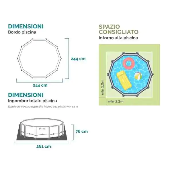 • Održavanje ovog bazena je jednostavno – redovno proveravanje pH vrednosti, upotreba kompatibilne Intex filter-pumpe i povremeno čišćenje zidova obezbeđuju kristalno čistu vodu tokom cele sezone. Kada se bazen ne koristi, preporučuje se korišćenje zaštitne pokrivke kako bi se sprečilo nakupljanje prljavštine, lišća i insekata.