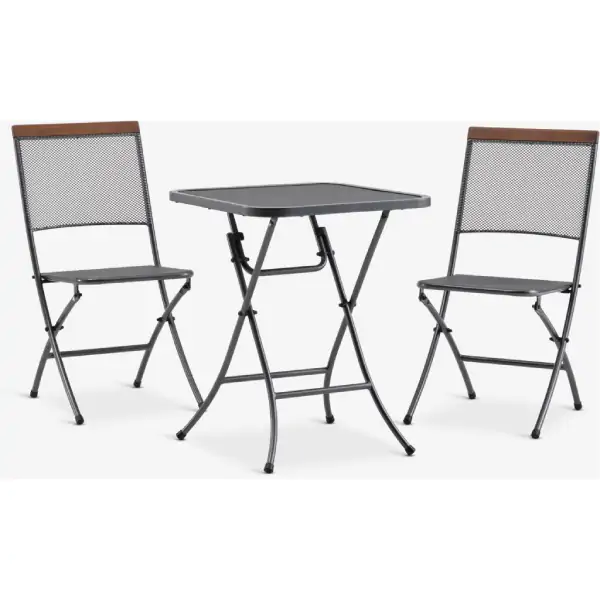• Baštenska lounge garnitura u sivoj boji, koja se sastoji od jednog stola i dve stolice, donosi savršen spoj funkcionalnosti i estetike za opremanje vaše terase, balkona ili bašte. Stolice dimenzija 46 x 54 x 89 cm, sa visinom sedišta 46 cm, imaju čeličnu konstrukciju i naslone za ruke od masivnog drveta eukaliptusa, obrađenog uljem, što im daje prirodan i topao izgled. Kvadratni sto dimenzija 60 x 60 x 75 cm, sa čeličnom konstrukcijom i Durasint®-premazom, pruža stabilnu površinu za odlaganje. Komplet je sklopiv, što olakšava skladištenje, a nosivost mu je impresivnih 220 kg. Drvo eukaliptusa nosi FSC™ 100% sertifikat, garantujući odgovorno poreklo. Preporučuje se odlaganje u zatvorenom prostoru tokom zime i redovno tretiranje uljem za drvo.