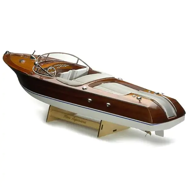 • Verna reprodukcija broda RIVA, u celosti je izgrađena s dvostrukim trupom od stakloplastike, pokrivenim kvalitetnim drvetom, koji je iznad vodene linije i palube lakiran sa lakom visokog sjaja, sedišta su urađena od kvalitetnog skaja. Jedinstven na tržištu, dvostruko ojačani trup sprečava vodu da prodre u unutrašnjost broda. Pripremljena je za vožnju sa snažnim elektro motorom klase 540, servo kormilom i elektroničkom regulacijom broja obrtaja. Završni elementi su kromirani sto omogućuje da ovaj veliki brod služi za ukras ili vožnju ili oboje zajedno.
