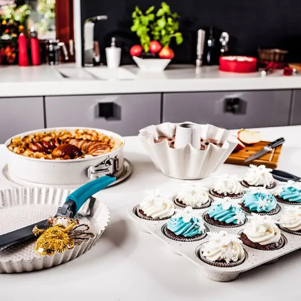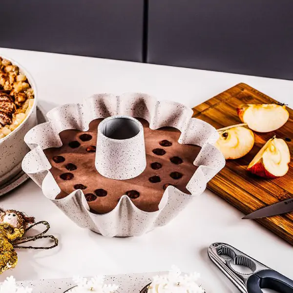 • Kalup za kuglof prečnika 23 cm iz kolekcije Nature brenda Ambition izrađen je od ugljeničnog čelika i namenjen je za upotrebu u rerni na temperaturama do +230°C. Njegov dizajn je inspirisan prirodnim kamenom, a svetla, nežno mrljasta površina prati savremene estetske trendove u kuhinjskom priboru. Zahvaljujući kvalitetnoj nelepivoj prevlaci, pecivo se lako peče i bez traga izdvaja iz kalupa. Kolekcija Nature nudi bogat izbor proizvoda – uključujući pravougaone tiganje za pečenje, kalupe za keks, mafine, tart, torte, kao i lončiće, klasične tiganje u tri veličine, duboke tiganje, roštilj tiganje i tiganje za palačinke – čime udovoljava potrebama svakog domaćeg kuvara koji ceni stil, funkcionalnost i izdržljivost.