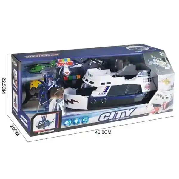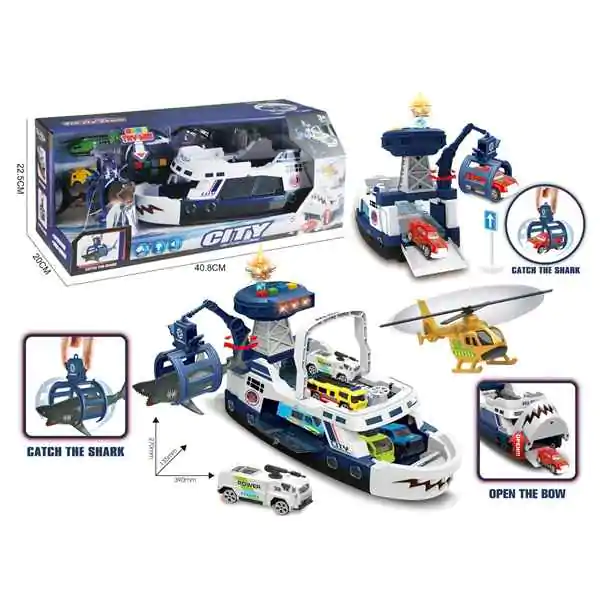 • Dečja igračka Brod: Gradski servisni čamac sa automobilom, helikopterom i ajkulom - Plava