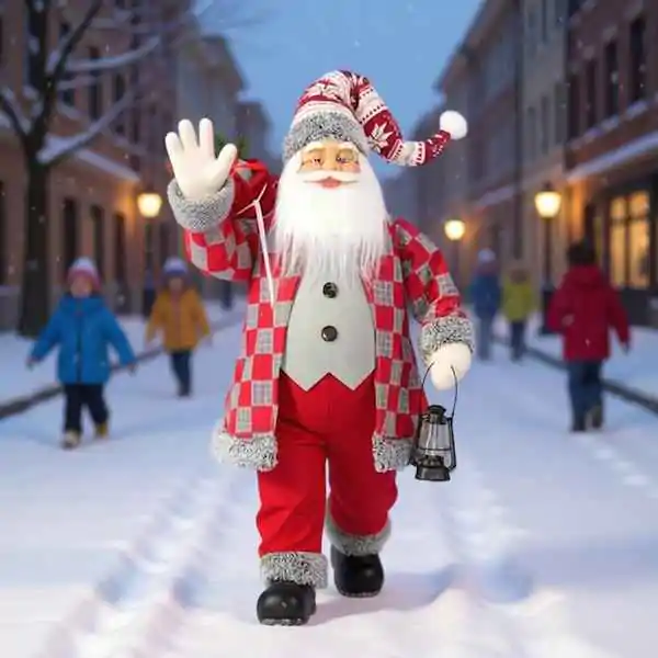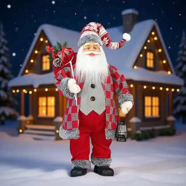 • Ova lepa plišna figurica, sa toplom vunenom kapom obrubljenom krznom, naocare, fenjerom i punom vrećom darova, stvara toplu i autentičnu božićnu magiju — bez obzira da li je postavljena kraj kamina, na verandu, uz ulazna vrata, pored božićne jelke ili na sto. Idealna je i kao poklon — elegantan, trajan i nezaboravan izbor.