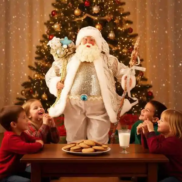 • Ovaj Deda Mraz je prava božićna zvezda, prekriven sjajem i elegancijom. Njegova figura je obučena u luksuznu, srebrno-belu odeću sa sjajnim sekicama na prsluku, koja se vide kao zimsko nebo puno zvezda. Beli, mekani krzni krajevi na kaputu i pantalonama dodaju topline i tradicionalnu čaroliju, dok mu je dug, pufasti beli brk i brada savršeno modelovani da izgledaju kao da su pokriveni ledenim kristalima.