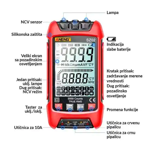 • Multimetar podržava širok spektar merenja: jednosmerni i naizmenični napon do 999.9 V, struju do 10 A, otpor do 99.99 mΩ, kao i kapacitet kondenzatora do 99.99 mF. Takođe omogućava testiranje dioda, prekida i tranzistora, kao i bezkontaktno ispitivanje faze (NCV) – funkciju koja omogućava detekciju napona bez direktnog dodira sa provodnikom.