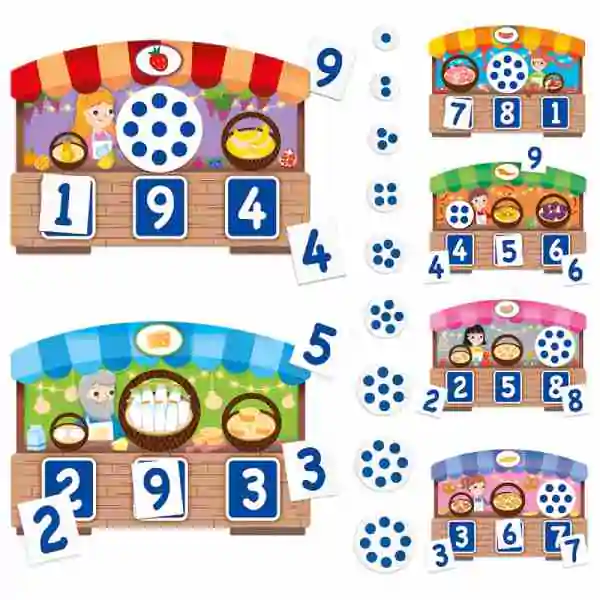 • Sadrži 6 bingo talona koji prikazuju pijačne tezge; 18 kartica sa brojevima; 18 žetona sa količinama; pamučnu vrećicu za odlaganje
