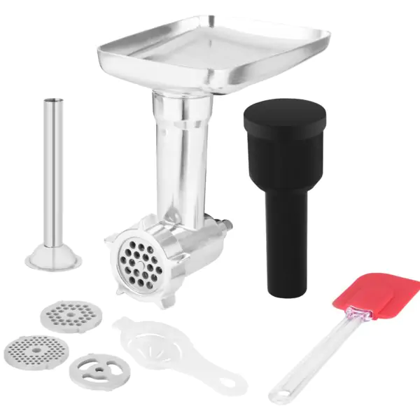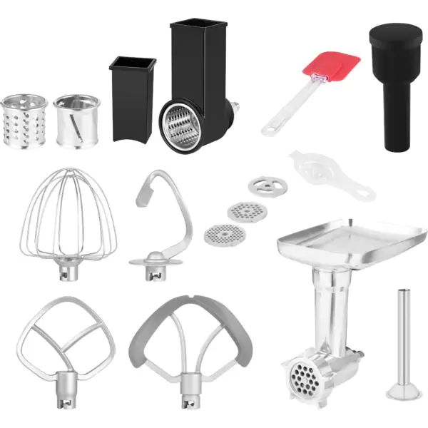• U osnovnom paketu dolazi bogat izbor dodataka: spiralne metlice, metlica od nerđajućeg čelika, gumirana metlica za mešanje krema, mašina za mlevenje mesa sa tri zamenjiva diska, te rende u obliku doboša sa tri zamenljiva nastavka
