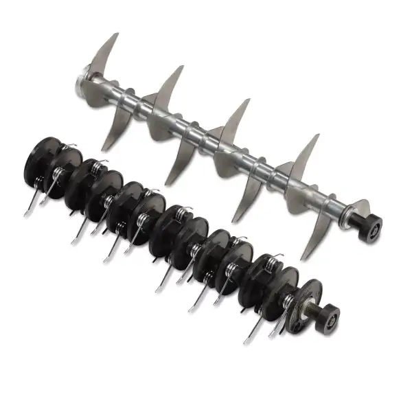 • Ovaj 3-u-1 uređaj omogućava skarifikaciju, aeraciju i sakupljanje u jednom koraku. Valjak sa 16 nerđajućih čeličnih noževa prodire u travnjak, dok valjak sa 24 kandže poboljšava prozračivanje tla. Centralno podešavanje radne dubine u 3 nivoa, uz dodatnu transportnu poziciju, osigurava lako podešavanje prema potrebama travnjaka.