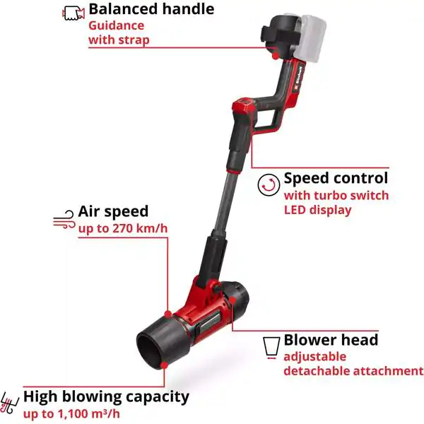 • Einhell Professional GP-LB 36/270 Li E BL je snažna akumulatorska duvalica za lišće, namenjena zahtevnim korisnicima i profesionalnoj upotrebi. Pripada Power X-Change sistemu i koristi Twin-Pack tehnologiju sa dve 18 V baterije, čime se postiže visok učinak bez ograničenja kablom.