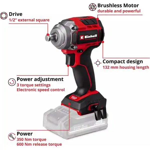 • Einhell Professional TP-CW 18/350-C Li BL Solo predstavlja kompaktan i snažan akumulatorski udarni odvijač namenjen zahtevnim radovima zavrtanja i odvrtanja, posebno pri zameni točkova i radu sa čvrstim spojnim elementima. Kao deo Power X-Change sistema, kompatibilan je sa svim Einhell 18 V baterijama iz iste platforme, što omogućava veliku fleksibilnost u radu.