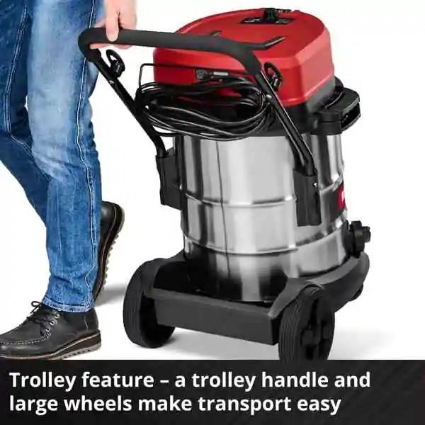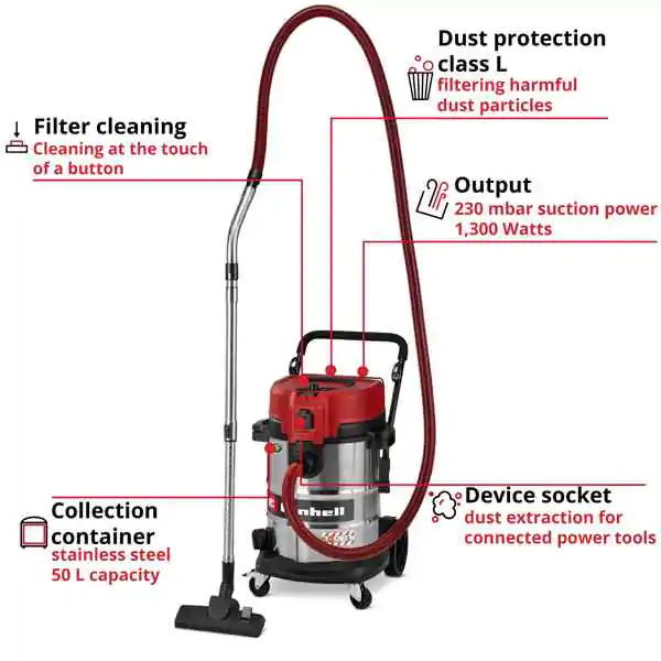 • Einhell TE-VC 5090 SACL je profesionalni usisivač namenjen suvom i mokrom čišćenju u domu, radionici i na gradilištu. Snažan motor od 1300 W obezbeđuje usisnu snagu od 230 mbar, omogućavajući dubinsko uklanjanje prašine, tečnosti i tvrdokorne prljavštine sa različitih površina. Uređaj je usklađen sa L klasom zaštite od prašine prema evropskim standardima i efikasno filtrira štetne čestice kao što su gips, kreč, pesak i zemlja, što ga čini pogodnim i za zahtevne građevinske radove.
