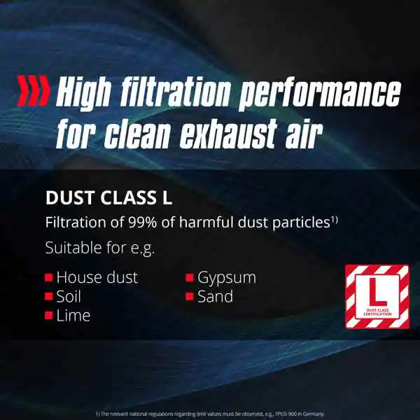 • Automatska utičnica za električni alat omogućava istovremeno uključivanje usisivača sa priključenim uređajem, čime se obezbeđuje efikasno odvođenje prašine tokom rada. Teleskopska cev od nerđajućeg čelika sa regulatorom protoka vazduha, robusno usisno crevo dužine 3 metra i kabl dužine 6 metara omogućavaju radni radijus do 9 metara i veliku slobodu kretanja. Točkovi, okretni točkići i transportna ručka obezbeđuju lako pomeranje, dok držači za pribor i namotavanje kabla omogućavaju uredno skladištenje.