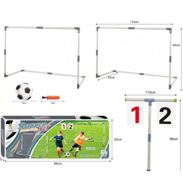 • Ovaj set sadrži dva montažna gola, širine 110cm i visine 80cm, pružajući deci priliku da razvijaju svoje fudbalske veštine