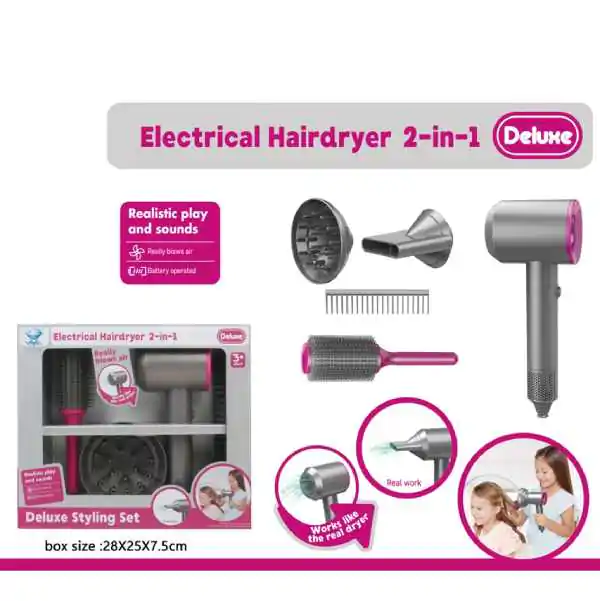 • Ovaj 2-u-1 set uključuje fen, četku i češalj, omogućavajući deci da se igraju kao pravi frizeri u svom domu