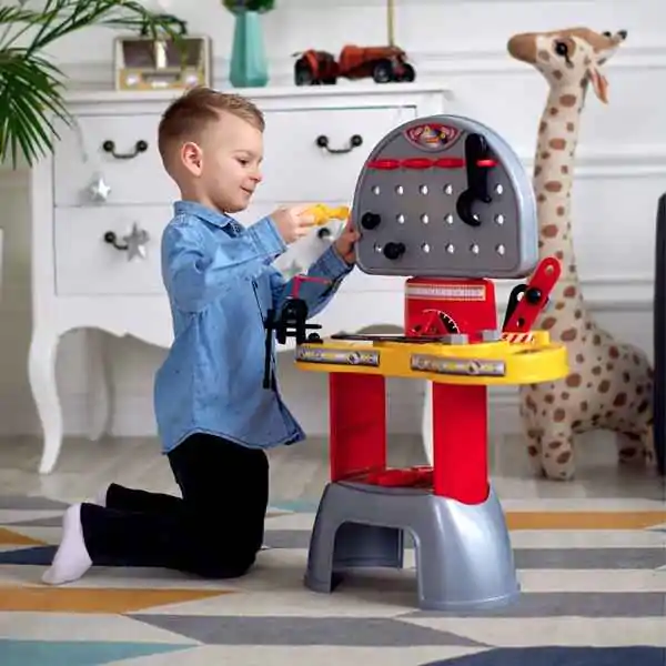 • Realističan dizajn: Alati i radni sto su prilagođeni dečijim rukama, ali oponašaju prave alate.