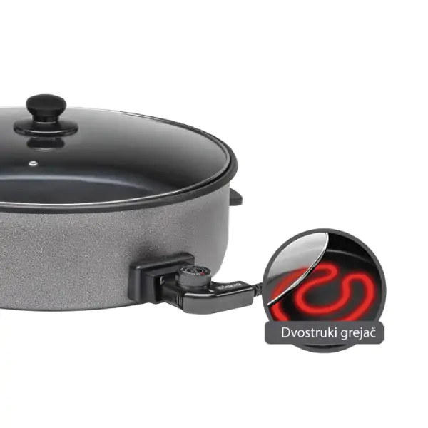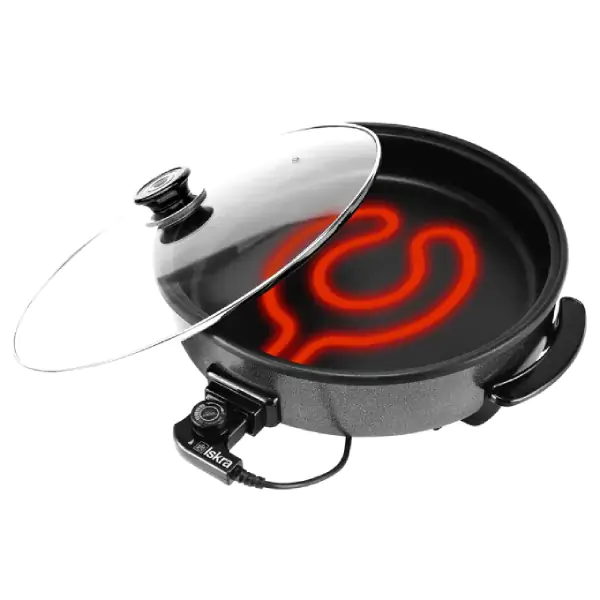 • ISKRA električni tiganj predstavlja svestrano i energetski efikasno rešenje za svakodnevnu pripremu hrane, omogućavajući kuvanje, prženje, dinstanje i odmrzavanje uz minimalnu potrošnju energije. Zahvaljujući dvostrukom grejaču, obezbeđuje ravnomerno zagrevanje cele površine i bolji efekat pripreme, bez opasnosti od pregrevanja pojedinih delova. Brzo zagrevanje i dugotrajno održavanje toplote omogućavaju vam da jela budu savršeno pripremljena i topla do serviranja. Podesiva temperatura omogućava precizno prilagođavanje različitim vrstama namirnica i tehnikama kuvanja. Kvalitetna anti-stick podloga sa premazom protiv lepljenja olakšava kuvanje bez dodavanja masnoće i čišćenje nakon upotrebe. Stakleni poklopac otporan na visoke temperature, sa praktičnim držačem, omogućava pregled hrane tokom pripreme bez gubitka toplote.