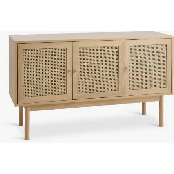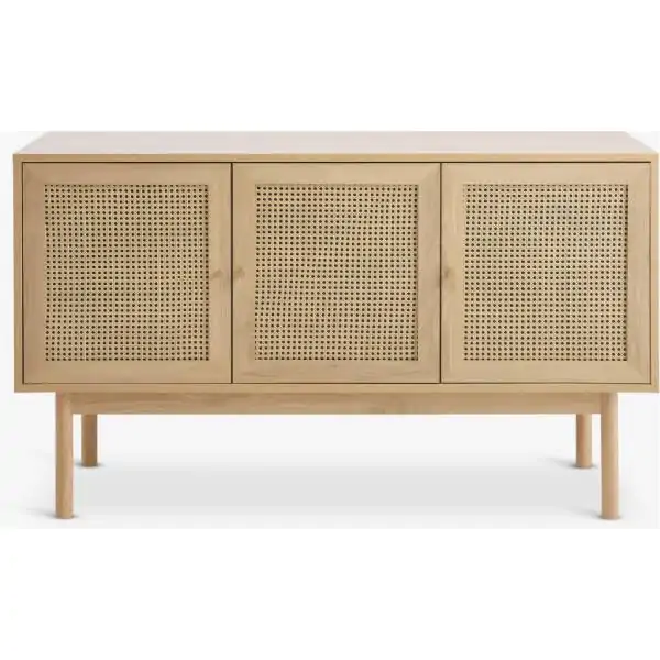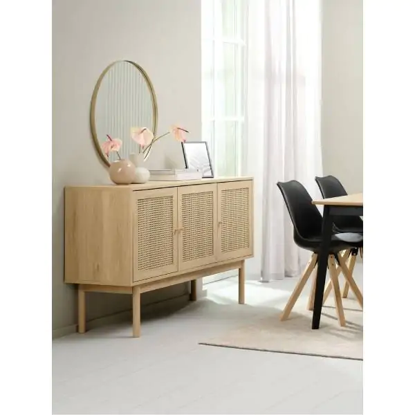 • Unesite dašak skandinavske elegancije u svoj dom uz ovu prostranu i funkcionalnu komodu u toploj hrast boji. Dimenzija 148x85x45 cm, ova komoda predstavlja savršen spoj estetike i praktičnosti, idealna za dnevnu sobu, spavaću sobu ili hodnik. Izrađena je od kvalitetnih materijala, uključujući medijapan, ivericu, masivno drvo kaučuka i čelik, što garantuje dugovečnost i stabilnost. Prednje strane vrata i fioka ukrašene su kombinacijom medijapana i PETAN (polipropilen) materijala, koji pruža moderan izgled i lakoću održavanja. Tri tiha vrata sa bešumnim zatvaranjem kriju tri prostrane police, pružajući dovoljno mesta za odlaganje posuđa, knjiga, posteljine ili drugih predmeta. Masivne noge od drveta kaučuka dodaju dozu prirodne topline i elegancije, dok ukupna težina od 51 kg svedoči o čvrstoj konstrukciji i kvalitetu izrade.