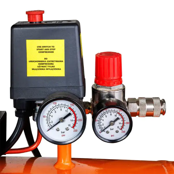 • Praktične karakteristike: regulator pritiska, ugrađeni manometri, ručka za transport, masivna metalna konstrukcija