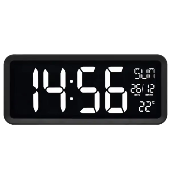 • Ovaj digitalni zidni sat predstavlja odličan izbor za sve koji žele pregledan prikaz vremena i dodatne korisne informacije u jednom modernom uređaju. Veliki beli brojevi visine 105 mm omogućavaju odličnu čitljivost i sa veće udaljenosti, dok automatsko podešavanje osvetljenosti i noćni režim čine displej prijatnim za oči u svako doba dana. Na ekranu se istovremeno prikazuju vreme, mesec, dan i temperatura, pružajući sve bitne informacije na prvi pogled. Korisnik može birati između 12-časovnog i 24-časovnog formata, kao i tri jezika za prikaz dana u nedelji (engleski, nemački, francuski). Zahvaljujući mogućnosti postavljanja na policu ili kačenja na zid, sat se lako uklapa u svaki prostor. U slučaju nestanka struje, memorija čuva podešavanja pomoću dve AA baterije (nisu uključene). U paketu dolaze USB adapter i dugačak kabl od 2,5 m, čiji se višak može uredno smestiti u kućište uređaja.