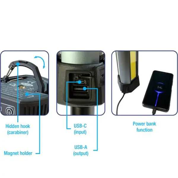 Multifunkcionalna radna lampa na stalku idealna je za radionice, garaže, gradilišta i kućnu upotrebu. Sa snagom od 1500 lumena pruža snažno i ravnomerno osvetljenje, dok litijumska baterija od 6000 mAh (3,7 V) obezbeđuje dug rad bez potrebe za stalnim punjenjem. Lampa je praktična i jednostavna za nošenje, zahvaljujući stabilnom stalku koji omogućava lako pozicioniranje pod različitim uglovima. Dizajnirana je sa stepenom zaštite IP20, što znači da je pogodna za upotrebu u zatvorenim prostorima. Savršeno rešenje za profesionalce i hobiste koji traže pouzdano osvetljenje.