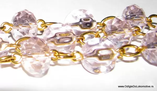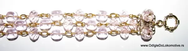 Narukvica nakit providno roze stakleni kristalići /uglasto brušeni i u obliku kockica, linijski povezani u tri reda sa filigrantskim pločicama u boji zlata i omčicama u boji zlata. dužina 23cm