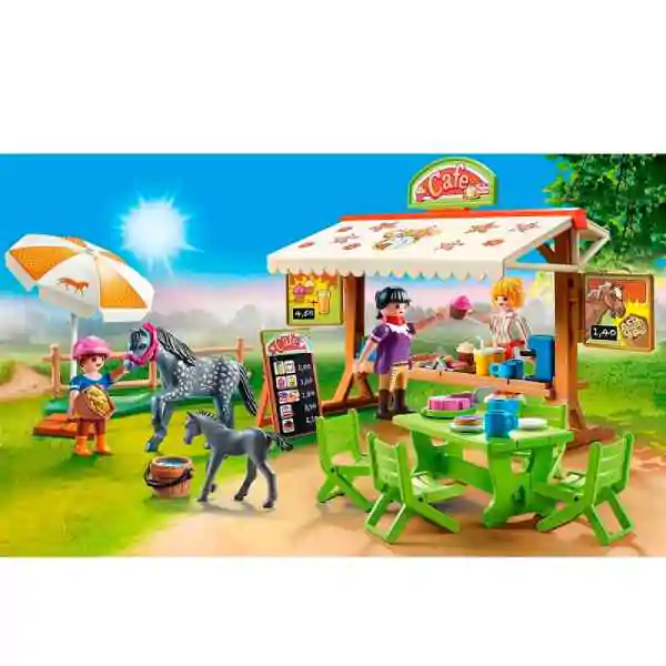 • Playmobil set se sastoji od tri Playmobil figurice, figure konja, ždrebeta i kafea sa baštom