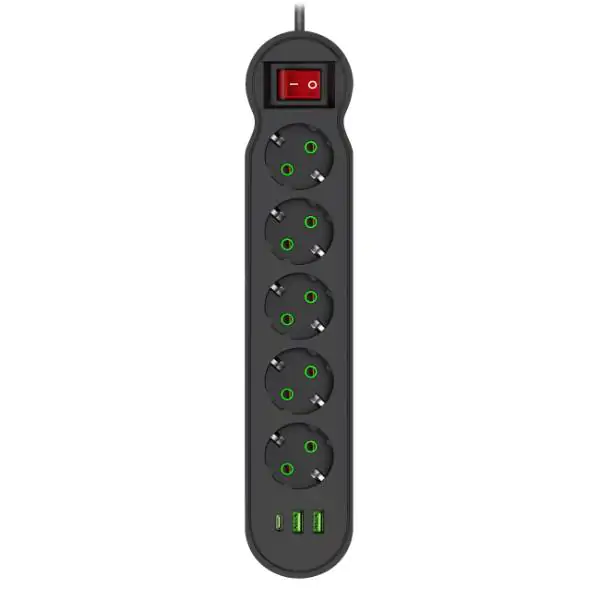 • Na jednom mestu dobijate pet uzemljenih utičnica i tri USB izlaza, od čega su dva klasična USB-A i jedan USB-C port, što znači da možete istovremeno povezati i napajati više uređaja bez potrebe za dodatnim adapterima
