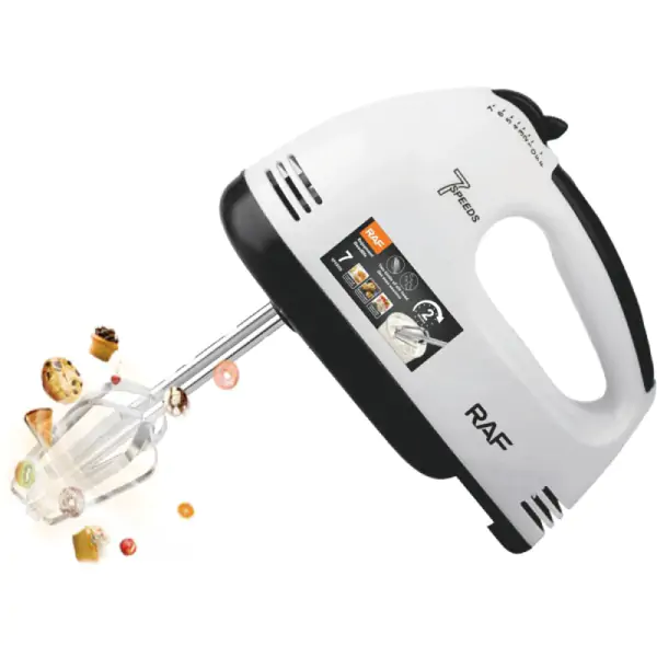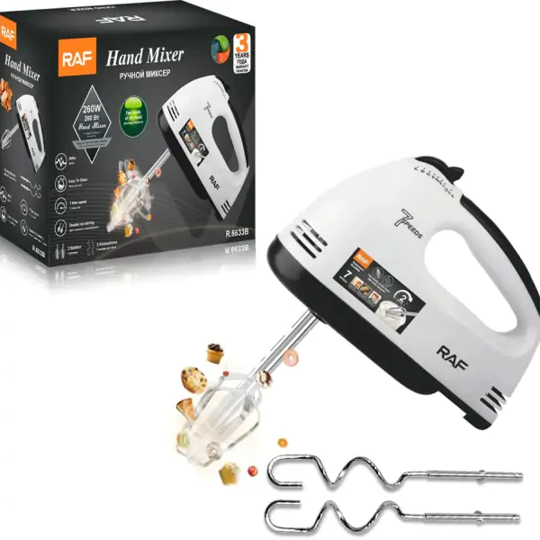 • Raf ručni mikser model R.6633WB snage 270 W predstavlja idealan izbor za svakodnevnu pripremu kolača, testa i drugih recepata, sa sedam brzina rada koje se lako prilagođavaju različitim potrebama – od laganog mućenja pavlake do gustog testa za hleb. U kompletu se dobijaju dve metlice za mućenje i nastavci za testo, čime ovaj mikser postaje multifunkcionalan alat u kuhinji, a snažan motor i prilagodljiv rad omogućavaju brzu i efikasnu pripremu sastojaka. Sa crno-belim dizajnom i kompaktnim dimenzijama 19 x 7 x 15 cm, uklapa se u svaku kuhinju, lagan je za korišćenje i odlaganje, dok kabl dužine 0,6 metara i rad na naponu od 220 V garantuju praktičnost i pouzdanost.