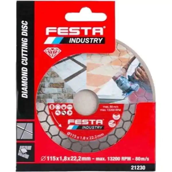 • Profesionalna dijamantska turbo rezna ploča FESTA 115 x 1.8 mm namenjena je za zahtevno sečenje i brušenje širokog spektra tvrdih materijala. Heksagonalni segmenti sa visokim sadržajem dijamantskih zrna obezbeđuju izuzetnu agresivnost rezanja, brži prolaz i dug radni vek čak i pod velikim opterećenjem.