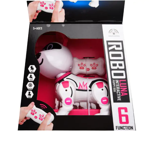 • Robo Luna na daljinsko upravljanje je interaktivni robot pas dizajniran za kaskaderske igre, koji kombinuje zabavu, svetlosne efekte i realistične pokrete kako bi pružio sate uzbudljive igre. Ovaj svestrani pas poseduje LED oči koje menjaju boju iz crvene u plavu, a proizvodi autentične pseće zvukove, laje i čak pleše uz muziku. Pomoću daljinskog upravljača u obliku kosti, deca mogu da upravljaju Luninim kretanjem u svim pravcima, klizanjem, okretanjem, sedenjem, ležanjem i stajanjem na zadnjim nogama, uključujući i okretanje u krug. Daljinski upravljač može da se koristi i kao "hranilica" – prinošenjem ustima, Luna ispušta zvukove i oči joj postaju crvene. Programabilna funkcija omogućava izvođenje niza radnji jedna za drugom. Dimenzija 21 x 17,3 x 17,3 cm.