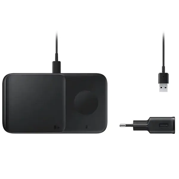 • Crni Samsung Wireless punjač Duo u kompletu sa kućnim punjačem, sa podrškom za brzo punjenje snage do 9W.