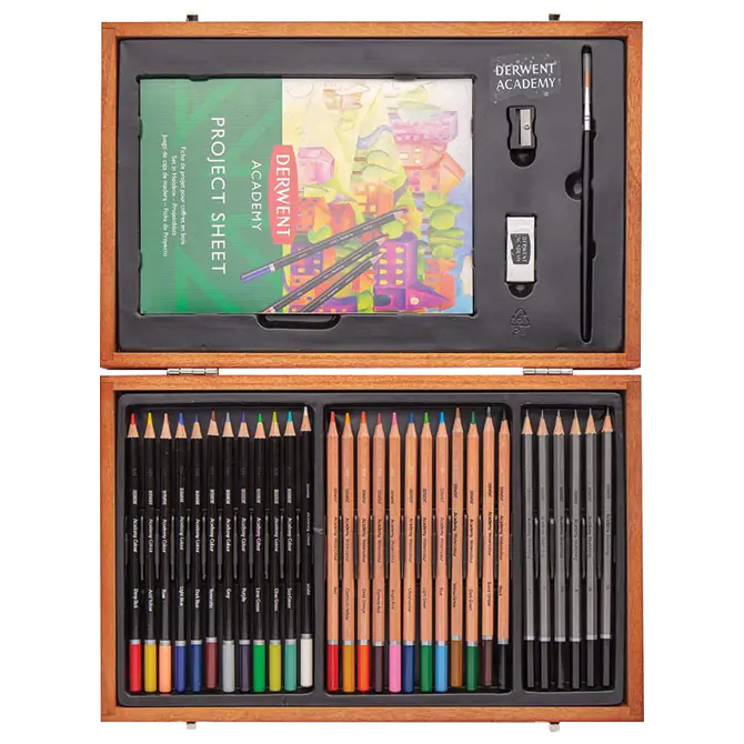 • Derwent Academy set u drvenoj kutiji predstavlja sveobuhvatan kreativni paket za sve ljubitelje crtanja i slikanja, sa kombinacijom drvenih boja, akvarel boja i grafitnih olovaka u praktičnom i elegantnom drvenom poklon kućištu. Set sadrži 12 drvenih boja, 12 akvarel boja (Aquarelle), 6 grafitnih olovaka u rasponu od 2H do 3B, skicen blok A5, gumicu, rezač i četkicu. Idealno za školu, hobi ili poklon.