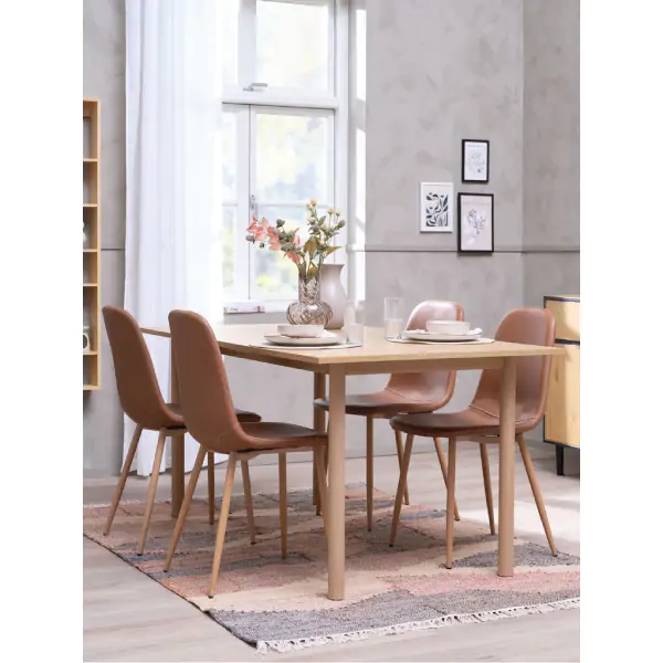 • Trpezarijski sto pravougaonog oblika, dimenzija 90 x 160 x 75 cm, u natur hrast boji, izrađen je od medijapana i melamina sa izgledom hrastovog furnira na gornjoj površini, dok su noge od čelika, pružajući stabilnost i moderan industrijski dizajn. Rastojanje između nogu je 128 cm i 58 cm, omogućavajući udobno smeštanje stolica. Isporučuje se u jednom paketu, težine 38 kg, i potrebno ga je montirati.
