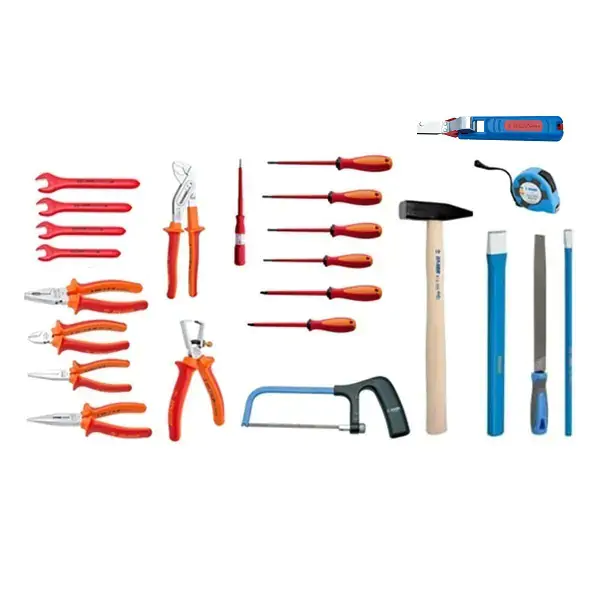 • Unior komplet od 24 alata za električare predstavlja profesionalni set namenjen svakodnevnim radovima na električnim instalacijama, sa posebnim naglaskom na bezbednost – svi VDE izolovani alati iz ovog kompleta namenjeni su za rad pod naponom do 1000 V! Ovaj set težine svega 3,69 kg obuhvata viljuškaste jednostrane izolovane ključeve (612175, 612178, 612181, 612182), skidač izolacije sa kukastim nožem (385H), kombinovana klešta (610422), izolovana papagaj klešta (447/1VDEBI), sečice kose (610427), pljosnata klešta (472/1VDEBI), izolovana klešta za skidanje izolacije (478/1VDEBI) i špicasta prava klešta (610437). Precizne radove omogućavaju VDE TBI pljosnati odvijači (616436, 616438, 616440, 616441) i VDE TBI krstasti PH odvijači (616444, 616445), dok su tu i ispitivač napona 220-250V (617659), pljosnati sekač za metal (601733), električarski sekač (608500), merna traka (612790), ram za testeru (753P), poluokrugla turpija (613002) i bravarski čekić (601802). Sa 24 alata, ovaj kompaktni set pruža sve što jednom električaru treba za bezbedan i efikasan rad na terenu.