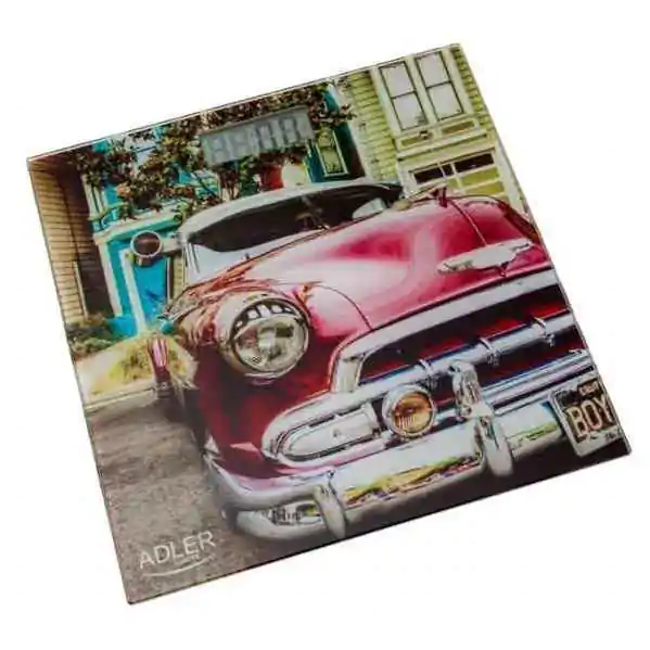 • Kaljeno staklo je ukrašeno slikom starog američkog old-timera,