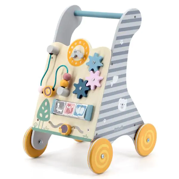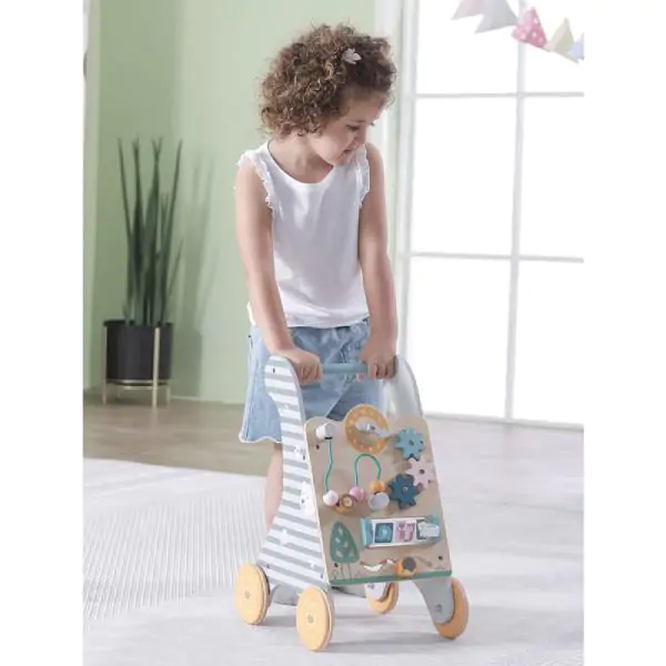 • Dete može gurati igračku ispred sebe, držeći se za ručku, što mu daje dodatnu sigurnost i podstiče ga da hoda voljnije i smelije. Prednja strana guralice sadrži sat sa kazaljkama, rolerkoster, zupčanike i druge interaktivne elemente koji će okupirati pažnju vašeg deteta i podsticati njegovu radoznalost.