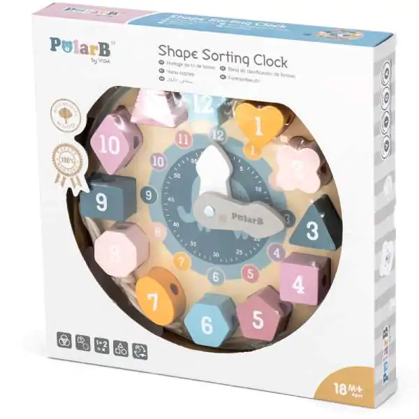 • Igračka u obliku časovnika ima 2 pokretne kazaljke, 12 geometrijskih blokova i niz
