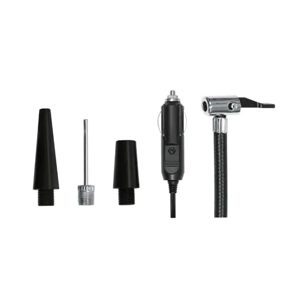• U isporuci dolazi komplet sa crevom i univerzalnim nastavcima, pogodnim za različite vrste ventila – od automobila i motocikla do sportske opreme i turističkog pribora.