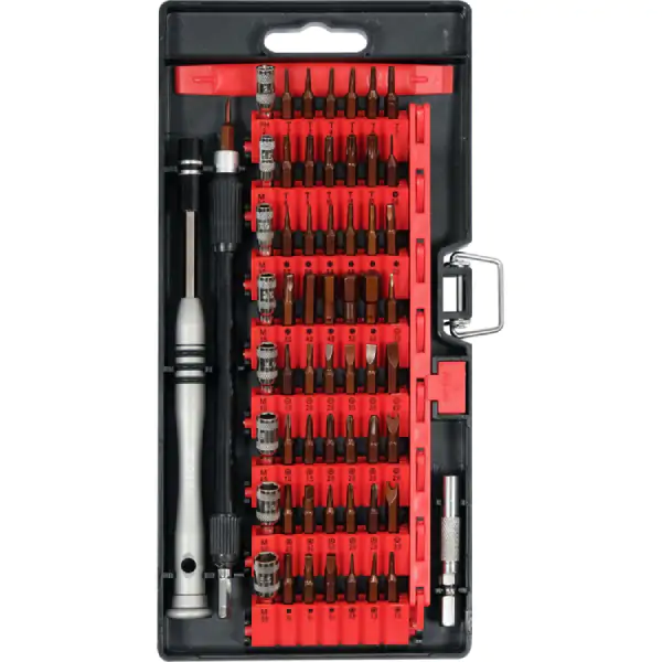 • YATO set za popravku mobilnih telefona od 61 dela predstavlja sveobuhvatno i profesionalno rešenje za servisiranje pametnih telefona, tableta, navigacionih uređaja, satova i naočara. Ovaj precizno osmišljen set obuhvata sve neophodne alatke za sigurnu demontažu i montažu osetljive elektronske opreme, uključujući specijalne bitove (odvijače) za različite tipove šrafova (Phillips, Torx, Pentalobe, Tri-wing, itd.), čime pokriva većinu modela na tržištu. Ključni elementi seta su adapter od 1/4", aluminijumska ručka za sigurno držanje, produžetak za pristup dubokim šrafovima i fleksibilni produžetak za rad pod uglom, kao i plastična ručka sa raznim nastavcima za bezbedno otvaranje i otključavanje ekrana i kućišta bez oštećenja. Svi alati su izrađeni od kvalitetnih materijala koji obezbeđuju izdržljivost i preciznost. Ovaj set je neophodna oprema za svakog profesionalnog servisera, ali i za entuzijaste koji žele da sami obave osnovne popravke i održavanje svojih elektronskih uređaja, obezbeđujući organizovanost, sveobuhvatnost i zaštitu delova tokom intervencije.
