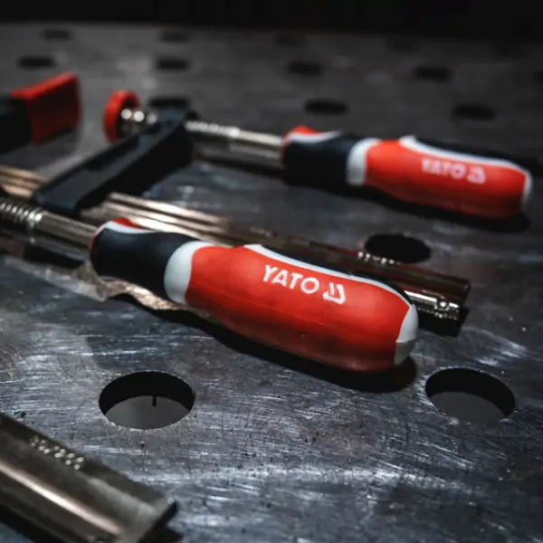 • YATO stolarska stega F-tipa dimenzija 1200/120 predstavlja vrhunski alat dizajniran za najzahtevnije stolarske i montažne radove, gde je neophodna maksimalna stabilnost, veliki radni domet i apsolutna čvrstoća pri stezanju ekstremno velikih radnih komada. Njeno telo, konstruisano od debelih i stabilnih šina sa dodatnim strukturalnim ojačanjima, pruža izuzetnu otpornost na savijanje i torziju pod intenzivnim opterećenjem, čime se obezbeđuje sigurno i pouzdano fiksiranje i poravnavanje. Vijak sa posebno izrezbarenim navojem, zajedno sa ojačanim profilom ruku, garantuje glatko i moćno stezanje, dok je ergonomska drška obložena mekim tehničkim materijalom za udobniji, sigurniji i snažniji hvat koji smanjuje zamor tokom produženog rada. Ključnu funkcionalnost za očuvanje kvaliteta obrade pruža pritisna ploča montirana na kuglastom zglobu, koja se automatski prilagođava uglu površine, i mekane plastične obloge koje štite finu površinu drveta od oštećenja, udubljenja i ostavljanja tragova. Ova robusna i svestrana stega je neophodna u svakoj profesionalnoj stolarskoj radionici, fabrici nameštaja ili montažnoj hali, gde se ceni dugotrajnost, preciznost i zaštita kvaliteta finalnog proizvoda u velikim formatima.