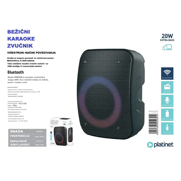 • Platinet PMG255 prenosivi zvučnik donosi snažan zvuk i sveobuhvatne mogućnosti zabave u kompaktnom i atraktivnom dizajnu. Sa izlaznom snagom od 20 W i najnovijom Bluetooth 5.0 tehnologijom, obezbeđuje stabilnu bežičnu vezu i bogat, čist zvuk za uživanje u omiljenoj muzici kod kuće, u bašti ili na putovanjima. Pored Bluetooth reprodukcije, uređaj poseduje USB i microSD slotove za direktno puštanje MP3 datoteka, kao i FM radio sa memorijom stanica. Posebna pogodnost je karaoke funkcija sa priključkom za mikrofon, koja omogućava organizaciju zabavnih pevačkih večeri sa porodicom i prijateljima. Atraktivno LED osvetljenje prati ritam muzike i stvara pravu atmosferu. Ugrađena baterija kapaciteta 2400 mAh obezbeđuje dugotrajnu autonomiju (vreme punjenja 7-8 sati). Dimenzija 290 x 210 x 180 mm. Platinet PMG255 je savršen izbor za sve ljubitelje muzike i zabave.